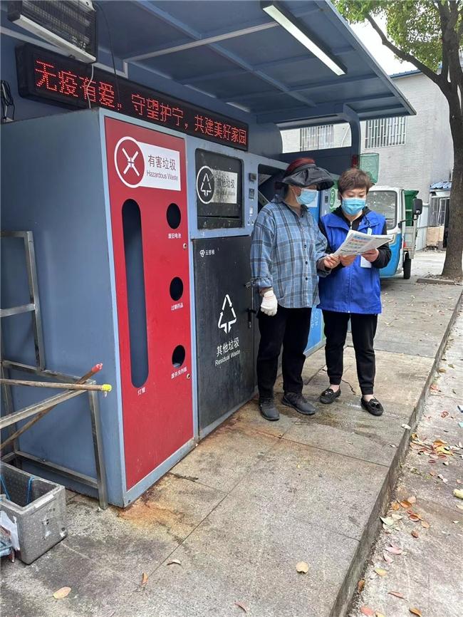垃圾分类志愿者在辖区内发放垃圾分类宣传单页,向居民宣传垃圾分类知识,通过面对面交流,手把手指导,活跃在垃圾分类投放点位上,指导居民正确分类投放,养成良好的垃圾分类习惯。