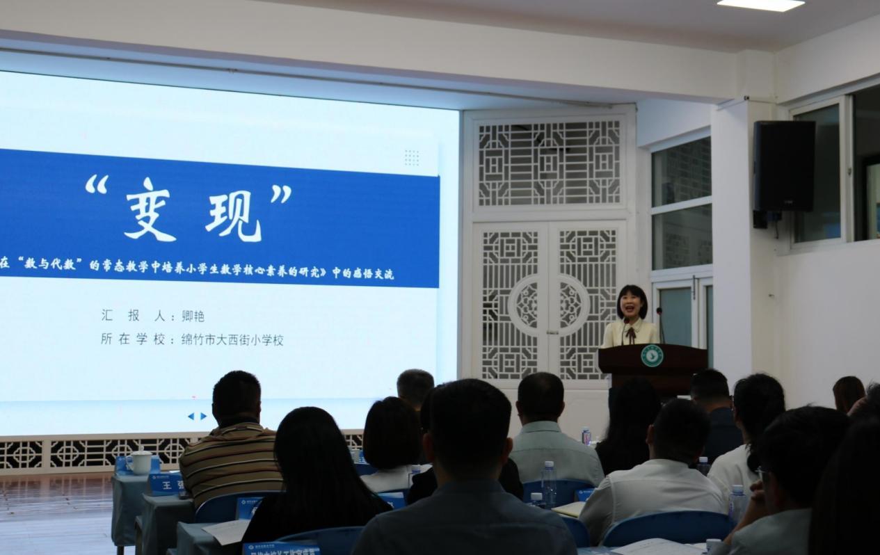 绵竹市卿艳名师工作室主持人、绵竹市大西街小学教导主任卿艳就大西街小学在如何在小学数学课堂教学、校本教研以及课程研发中的真实行动做了分享。大西街小学一直着力课堂深耕,着眼生命的激扬,着重生态构建。