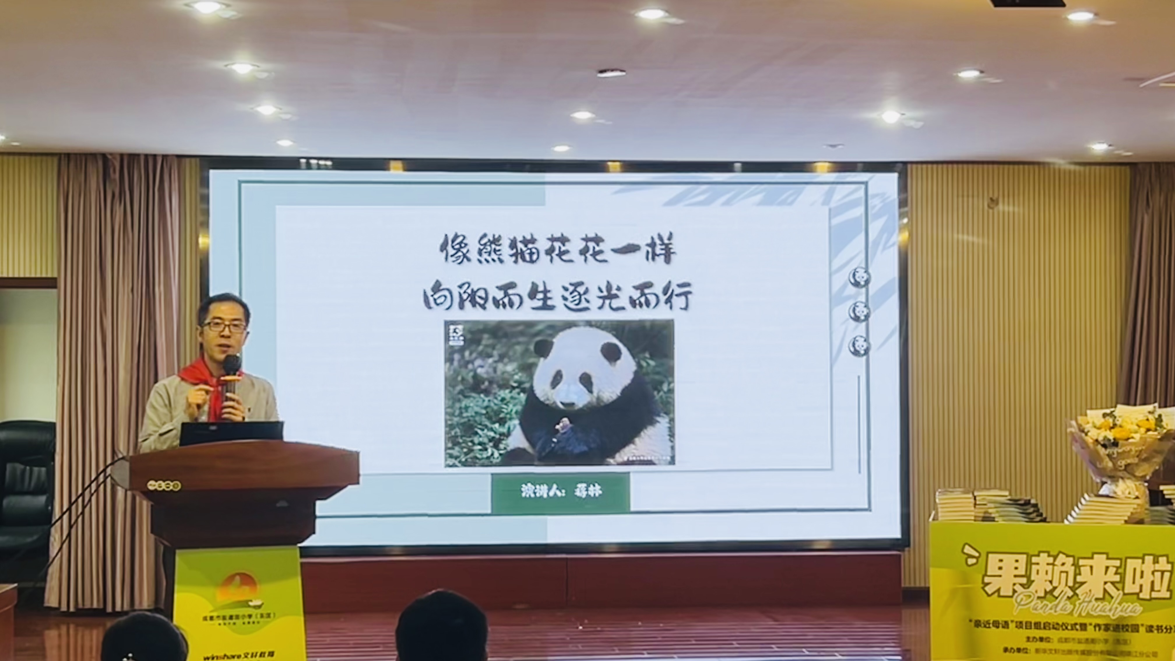 最是一年春好处,校园处处读书声。为营造良好阅读氛围,培养学生爱读书、读好书的良好习惯,4月18日,在第29个世界读书日即将到来之际,成都市盐道街小学(东区)特邀中国作家协会会员、巴金文学院及成都文学院签约作家、成都少年文学院副院长、四川省精神文明建设“五个一工程”奖获得者蒋林老师走进校园,为孩子们带来《熊猫花花》以及明星熊猫的精彩故事分享。