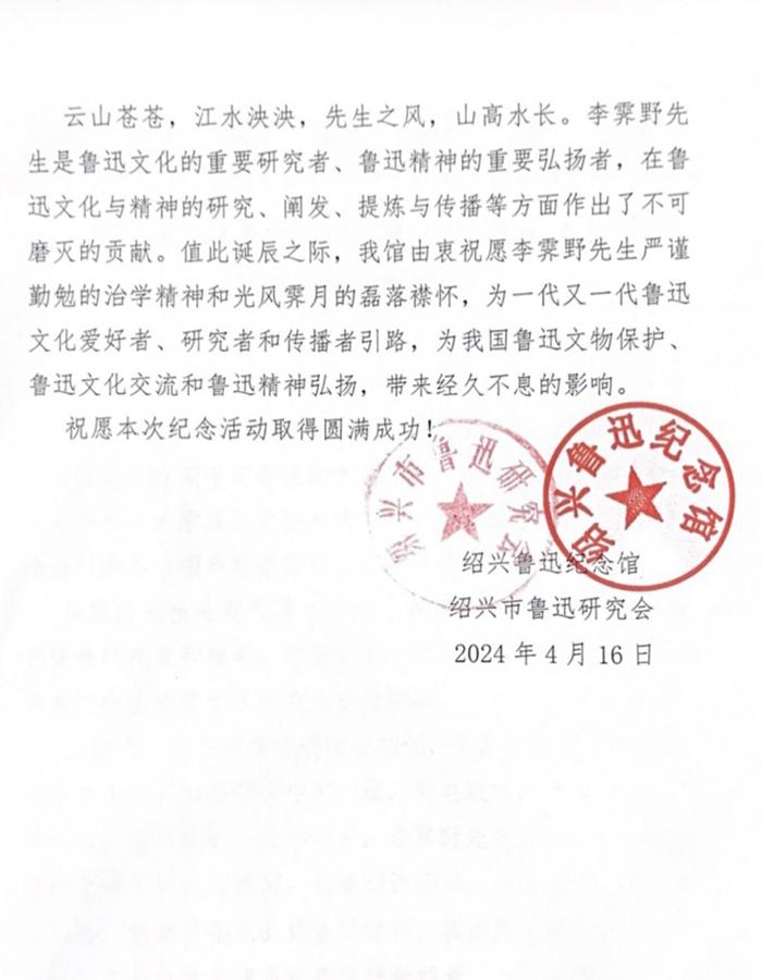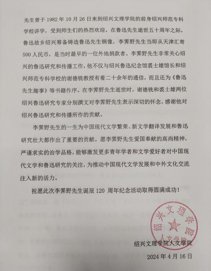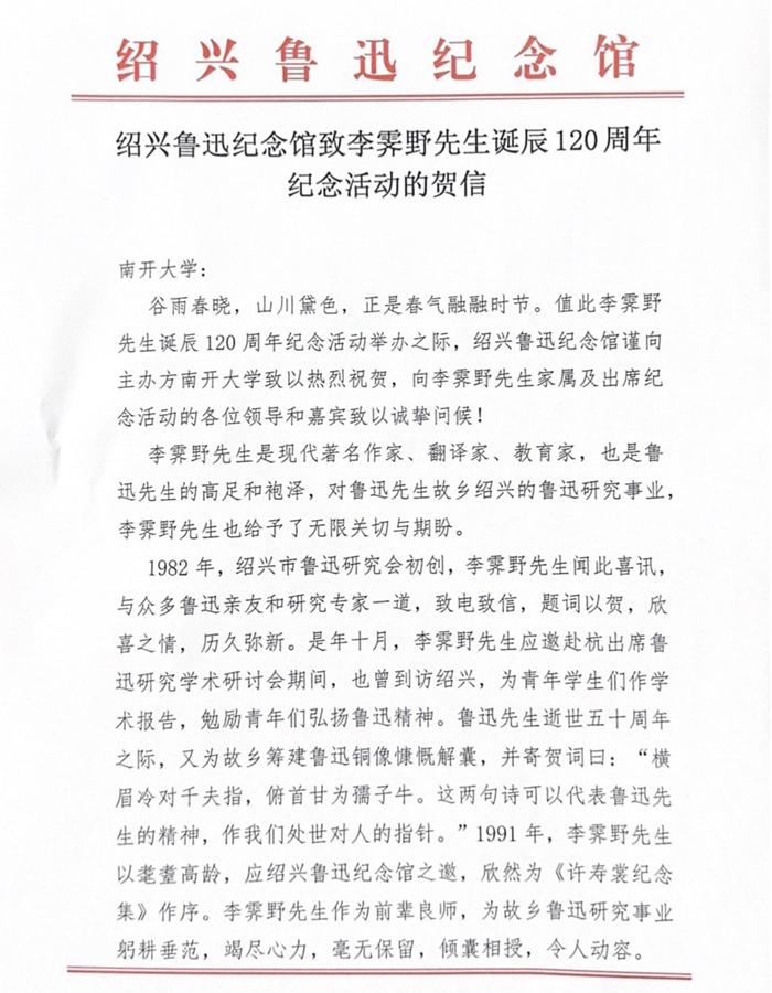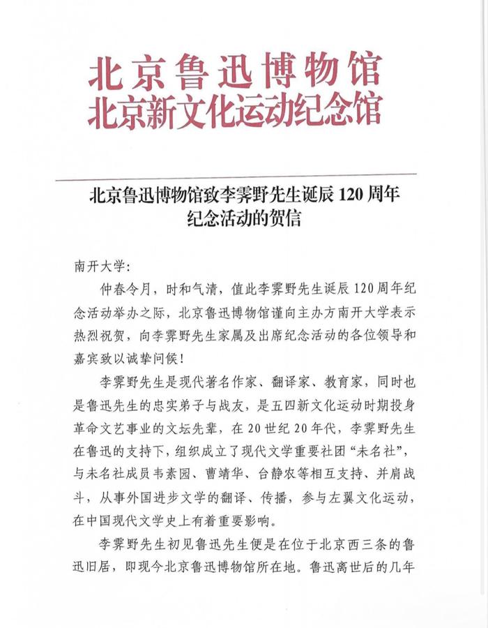 贺信纷至| 李霁野先生诞辰 120 周年纪念活动