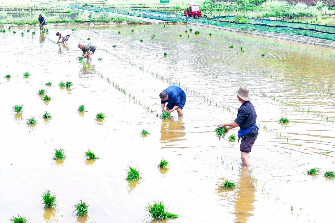 田里的村民,低着头,弓着腰,左手熟练地捋送秧苗,右手将秧苗如蜻蜓点水般,轻盈、快速、准确地插进泥土里,指间的秧苗在稻田里由点成线,由线成片。小时候插秧是被逼无奈,现在插秧已成回忆,你有多久没有看过这样的秧田。