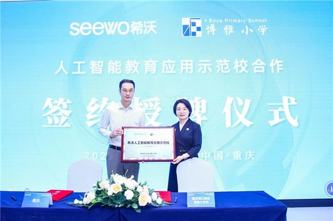 近日,在第83届中国教育装备展示会现场,希沃与重庆两江新区博雅小学校进行了人工智能教育应用示范校合作签约授牌仪式,视源股份未来教育集团商用显示事业部总经理黄柏林、博雅小学校副校长林晓宇出席活动,开启校企合作的新篇章。