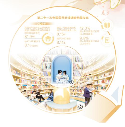 由中国新闻出版研究院发布的第二十一次全国国民阅读调查结果显示,2023年,我国成年国民包括书报刊和数字出版物在内的各种媒介的综合阅读率为81.9%,较2022年的81.8%提升了0.1个百分点。