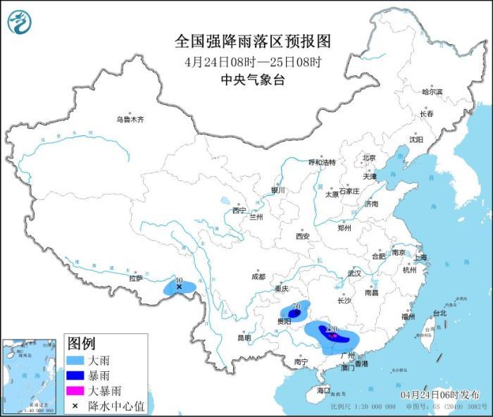 据中央气象台网站消息,中央气象台4月24日06时继续发布暴雨蓝色预警:预计,4月24日08时至25日08时,贵州中东部、广西东北部、广东中西部等地部分地区有大到暴雨,局地大暴雨(100~120毫米)。上述部分地区伴有短时强降水(最大小时降雨量30~50毫米,局地可超过60毫米),局地有雷暴大风、冰雹等强对流天气。