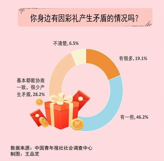调查中,65.3%的受访者表示身边有因彩礼产生矛盾的情况,其中19.1%的受访者表示有很多。28.2%的受访者觉得周围人基本能在彩礼问题上协商一致,很少产生矛盾,6.5%的受访者不清楚。
