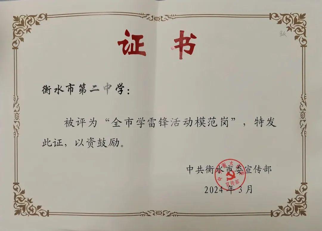 4月25日了解到,河北衡水二中日前荣获衡水“全市学雷锋活动模范岗”称号。该学校深入学习贯彻党的创新理论,依托雷锋精神培正育人,以学雷锋系列活动为载体,提升师生的精神品质,积极打造学雷锋高地,还荣获全国文明单位、河北省文明校园、河北省先进基层党组织、河北省巾帼文明岗等荣誉称号。
