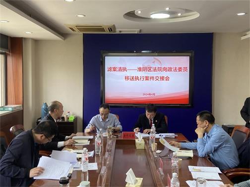 2024年4月25日下午,江苏淮安市淮阴区委政法委组织召开政法委员助力执行案件交接会,推动“滤案清执”机制建设。会议由淮阴区委政法委副书记陈中涛主持,淮阴区法院分管执行院领导、执行局法官、淮阴区13个镇街政法委员参加会议。