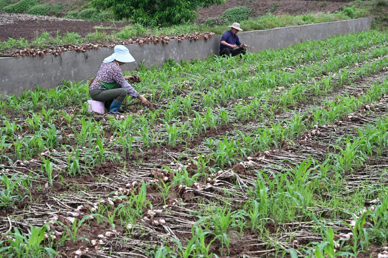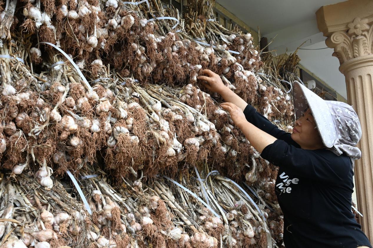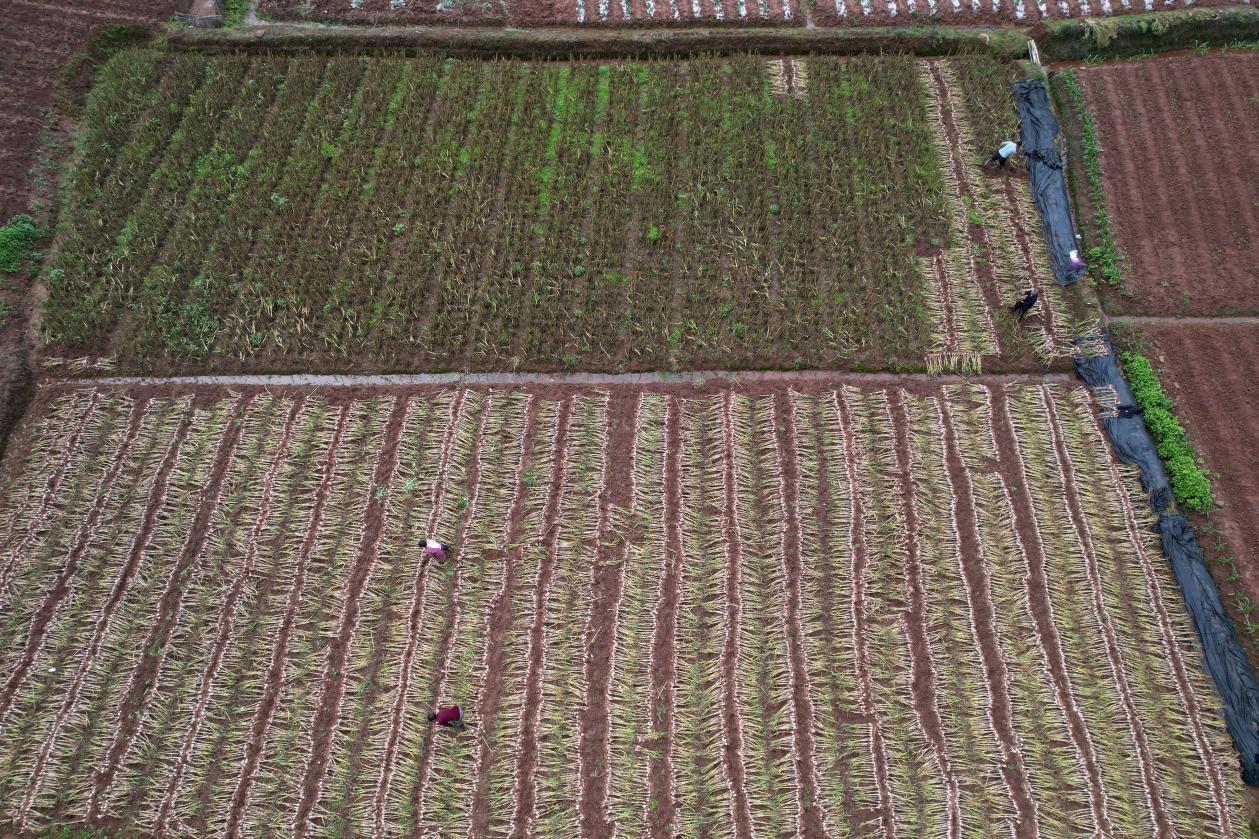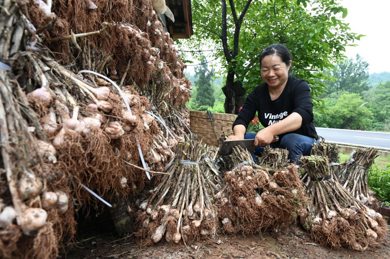 4月25日,在内江市东兴区田家镇火花村,当地村民正在抢收和晾晒紫皮大蒜。