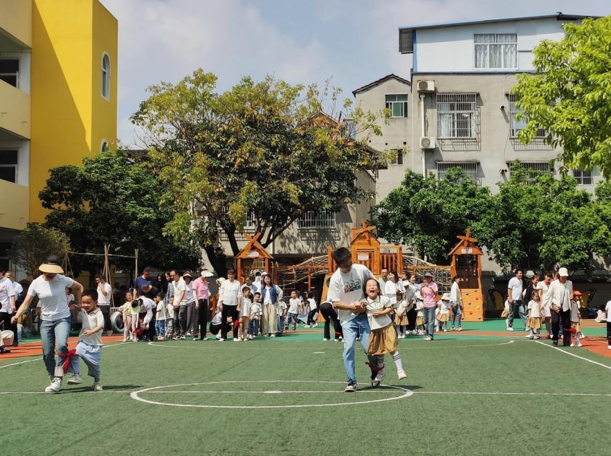 随后,本部中班组在园内操场开启了一场有趣的亲子运动会,活动中师生及家长玩起了具有园区特色的民间体育游戏,通过游戏传递快乐,为节日的校园平添喜悦的色彩。
