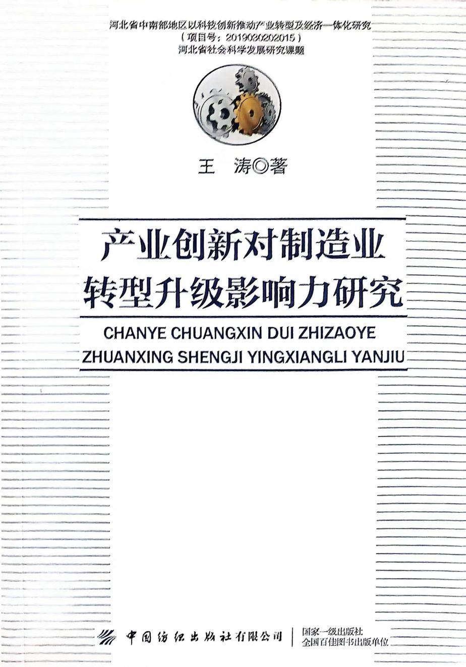 王涛所著的《产业创新对制造业转型升级影响力研究》一书,已于2023年10月由中国纺织出版社出版出版发行,该书以制造业经济为研究对象,以产业创新为研究路径,探讨了产业创新对制造业经济转型升级的影响。将对助力国家经济发展,为各级政府进行经济决策和制定经济发展规划提供专业化服务。