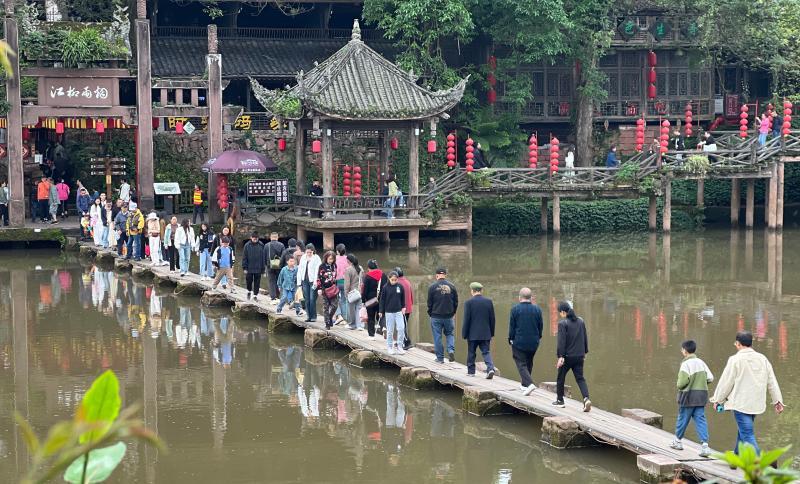 假期的柳江古镇景区游人如织。景区通过“古镇+音乐会”“古镇+红色电影”,丰富旅游场景,把吃、喝、玩、乐、购等文旅元素“串珠成链”,让游客在古镇过上“快节奏的慢生活”。