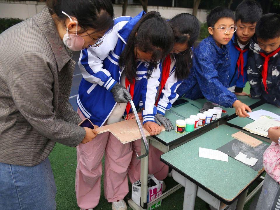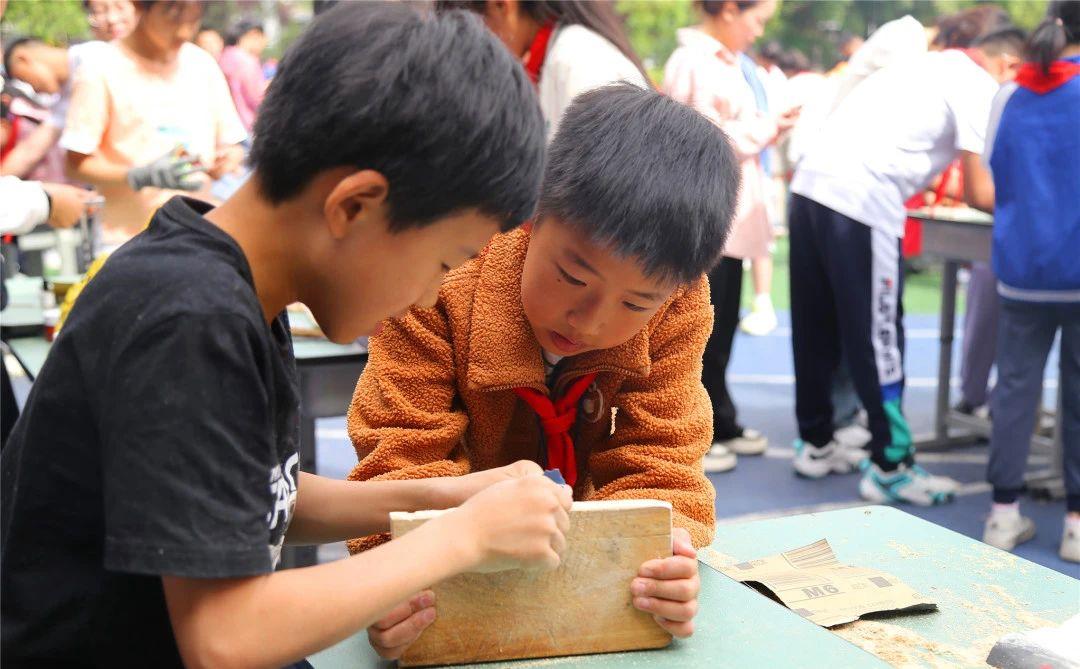 “我固定木块,你拉锯,准备,一,二……”“上色的时候手要稳,沉住气!”……展评活动现场,各班参赛的选手们专心致志,全身心投入,制作过程中,时而眉头紧蹙,时而喜笑颜开,拉锯的同学配合默契,其余队友合力固定木头也是心有灵犀。老师们和家长们也为大家踩着节奏,加油打气,同学们都屏息凝神观看这场关乎班级荣誉的“拉锯战”,感受“小鲁班”的乐趣。