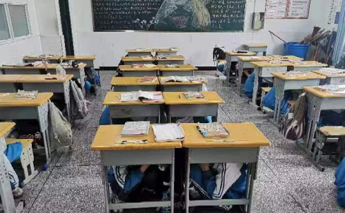 演练开始前,各楼道疏散负责人员提前到达指定位置。随着第一次警报的响起,各班主任立即指挥学生就地避震,同学们迅速有序躲到桌子下面或其它防护设施内,班主任及时纠正不正确的防护姿势。