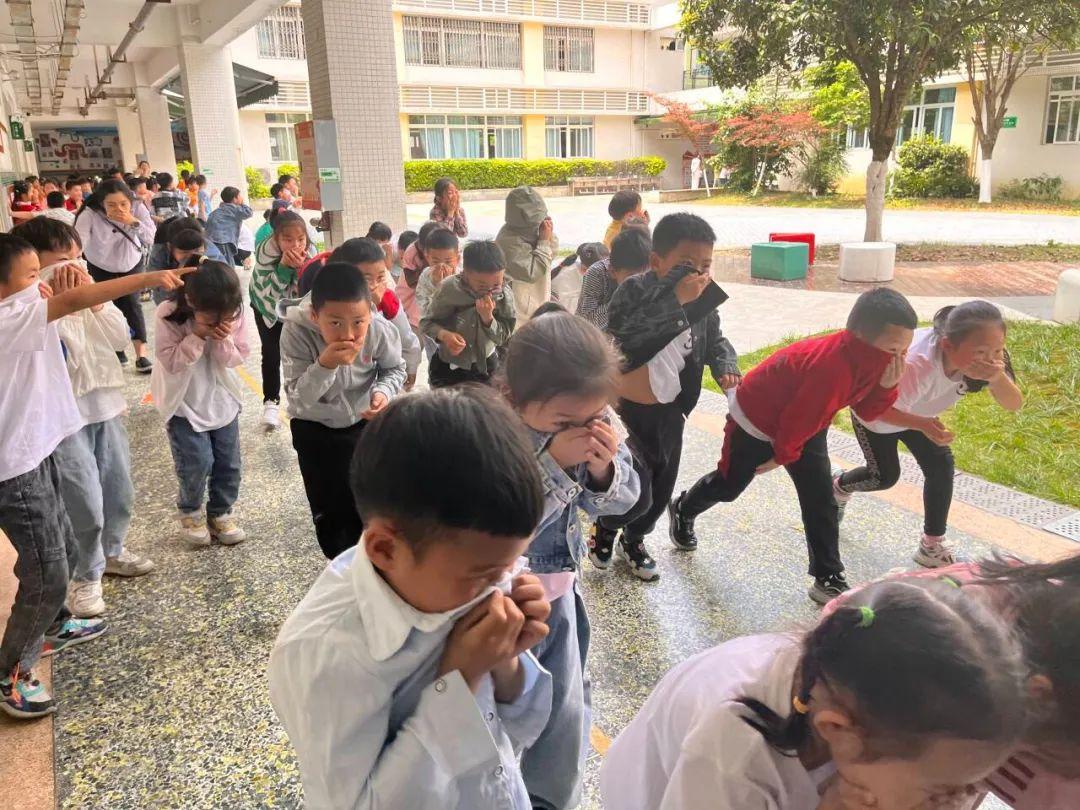 伴随着警报的鸣响,疏散演练正式开始!应急点位的老师根据消防演练应急预案要求,迅速朝着指定监护岗位奔驰。教室里的孩子们在老师的指挥下,迅速捂住口鼻、俯身有序撤离。在短短几分钟时间里,师生们稳中有序地安全撤离到了操场。