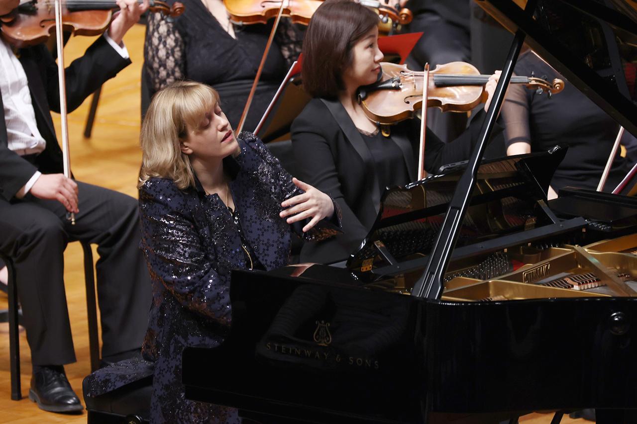 回音萦绕,余响不绝。金发飘逸的吉恩·比尔斯潇洒上台,她是《回音余响》的作曲家,同时也是该曲目的钢琴演奏家。她将自己近年来对声音回想的思考与西方哲学中的二元对立概念转化为具体而具象的音符,引领我们走入充满无限可能的音乐世界。钢琴与弦乐从开篇的各自独立最终走向相互交织,仿佛进行一场关于存在与虚无的议题。值得一提的是,比尔斯汲取了巴赫、肖斯塔科维奇的创作精髓,同时巧妙地借鉴德国音符命名体系,将自己的名字融入作品的主题之中,形成fa-mi-fa-mi-si的音符组合,这是自我身份的表达,亦是对传统音乐的致敬。同时,这部作品呼应了比尔斯尤为钟爱的普罗科菲耶夫所创作的《第二钢琴协奏曲》,展现了跨时代的音乐共鸣与情感交流,饱含物理性与音乐的抽象、艰深。比尔斯用她的才华和热情,不断挑战艺术的边界,表达对人类精神世界的反思与感悟,那些在音乐中回荡的“余响”,如同生命的回音,在喧嚣的世界中寻到片刻的宁静与慰藉。