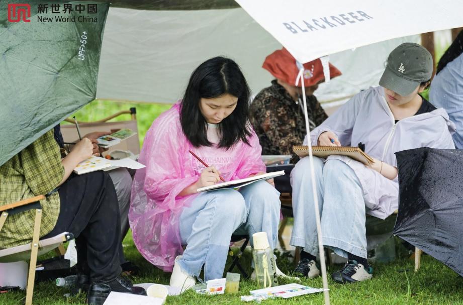 在游戏区域,家长和孩子们排队进行套圈游戏,并领取扇子、写生本、种子盲盒等小奖品。而带着写生本和颜料的“画家”们则散落于草坪各处打卡地,用对自然的独特理解,绘制出一幅幅绿意盎然的画卷。哪怕雨势渐强,帐篷中安静作画的人们也未被惊扰,有满地的绿意做背景,这一幕也如画般充满艺术感。