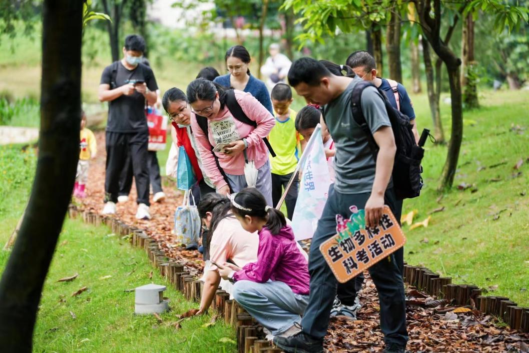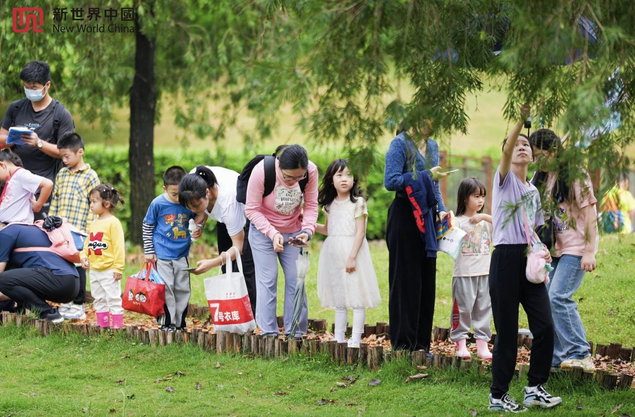 绿意在社区的任意角落尽情舒展。在广佛新世界的湿地公园中,一节“走读岭南∙绿美新世界”社区自然课以益趣结合的形式呈现,让孩子们在城市绿洲之中认识到自然界中植物种类的丰富性,理解生物多样性对生态系统的重要性。在带队导师的带领下,家长和小朋友们穿梭过重重绿色和静谧湖泊,抬头寻找枝头的花朵,低头为成群的锦鲤惊叹,争先恐后地用手机小程序对神秘生物进行识别……