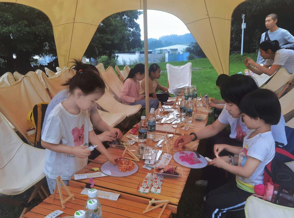 在DIY手工摊,孩子们的艺术天赋被激发,专心致志地用手边的不同物品制作一只可爱的树叶小狗、清新的自然书签,或者一把浪漫的春日团扇。