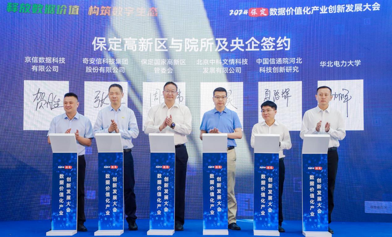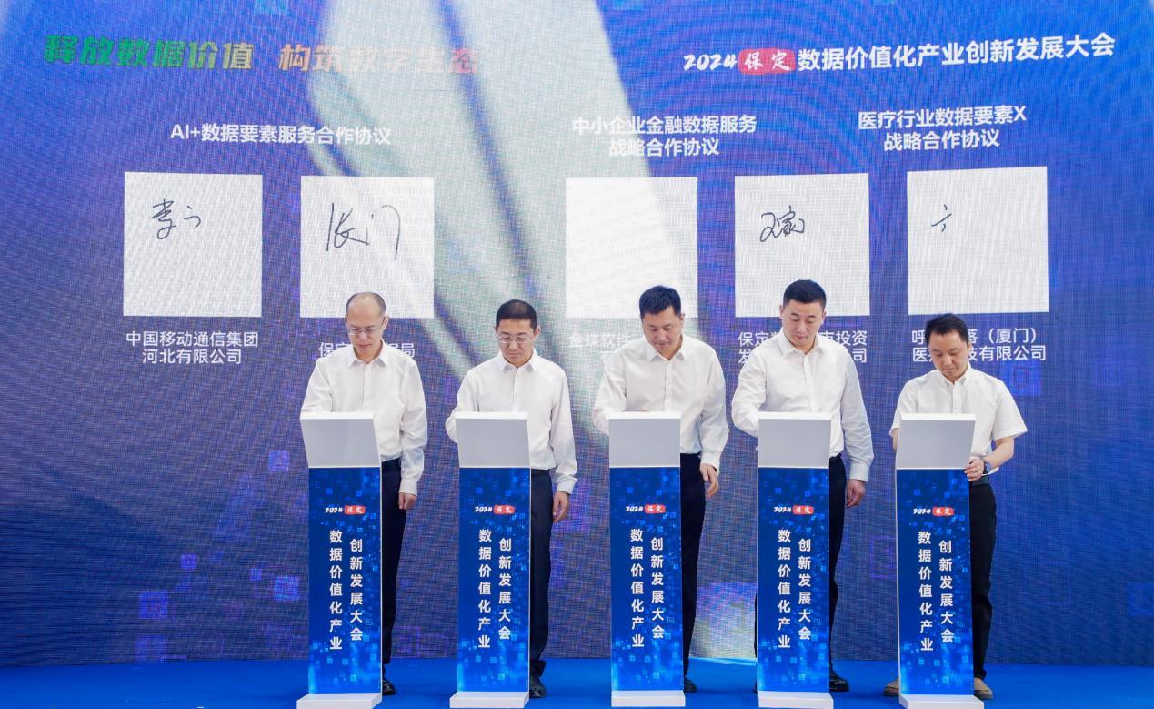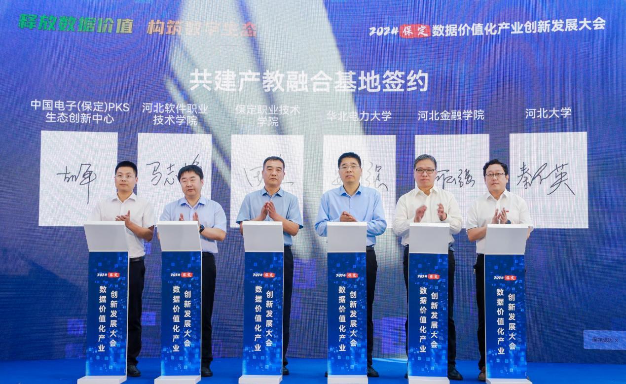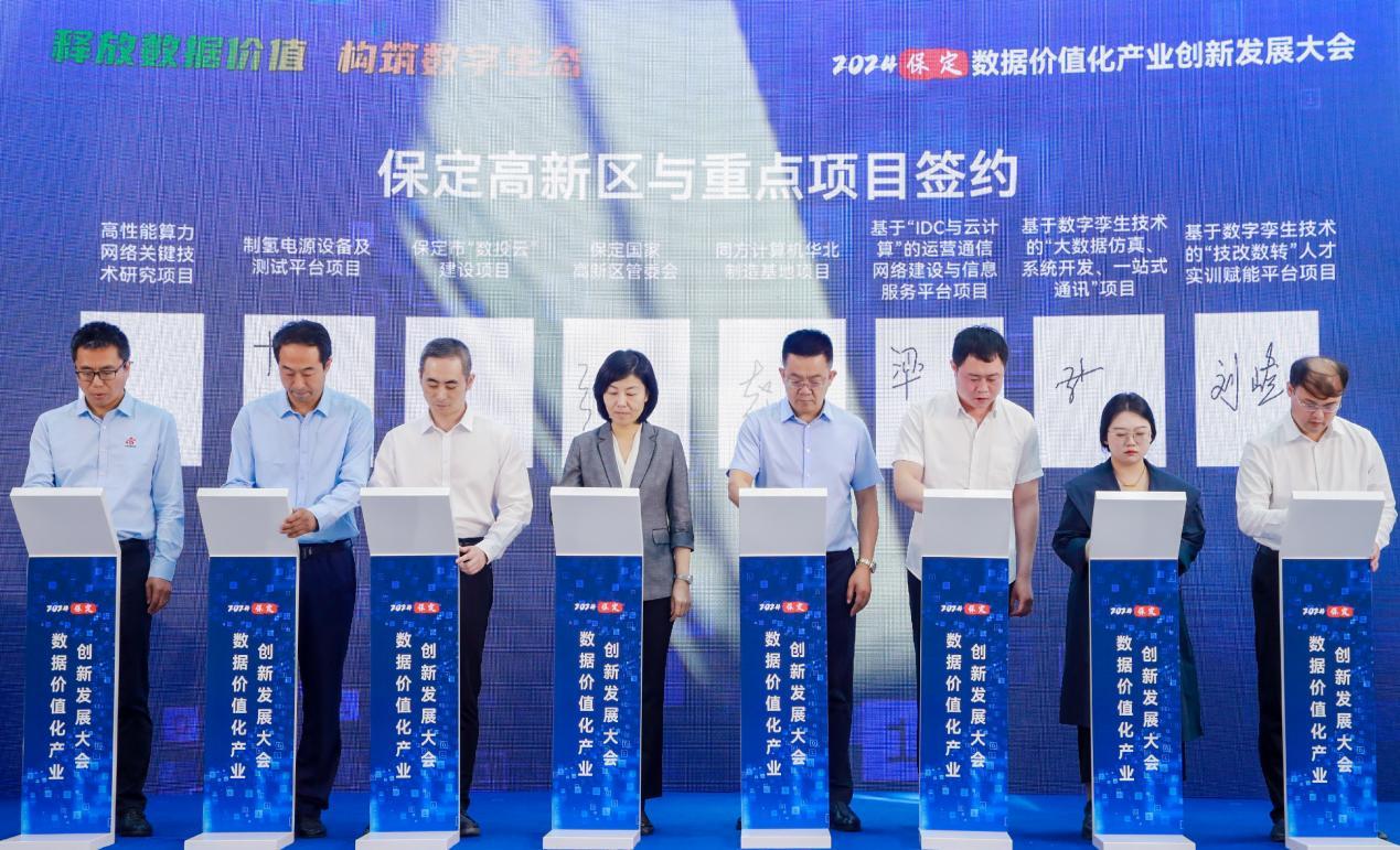大会现场举办了重点项目合作签约仪式。保定市数据局与河北移动签署AI+数据要素服务合作协议;保定数投集团与呼吸部落(厦门)医疗科技有限公司签订医疗行业数据要素X战略合作协议,与金蝶软件签订中小企业金融数据服务战略合作协议。中国电子(保定)PKS生态创新中心(中电互联、中国软件代表)与华北电力大学、河北大学、河北金融学院、河北软件职业技术学院、保定职业技术学院共建产教融合基地签约。保定高新区党工委副书记,管委会副主任周林伟代表保定高新区,与院所及央企签约。保定高新区与云融科技公司、数投集团有限公司、吉讯股份有限公司、北京雷动智创科技公司、河北明材数字科技有限责任公司、北京广厦网络技术公司、远特(北京)通信技术公司等多家重点企业签约。
