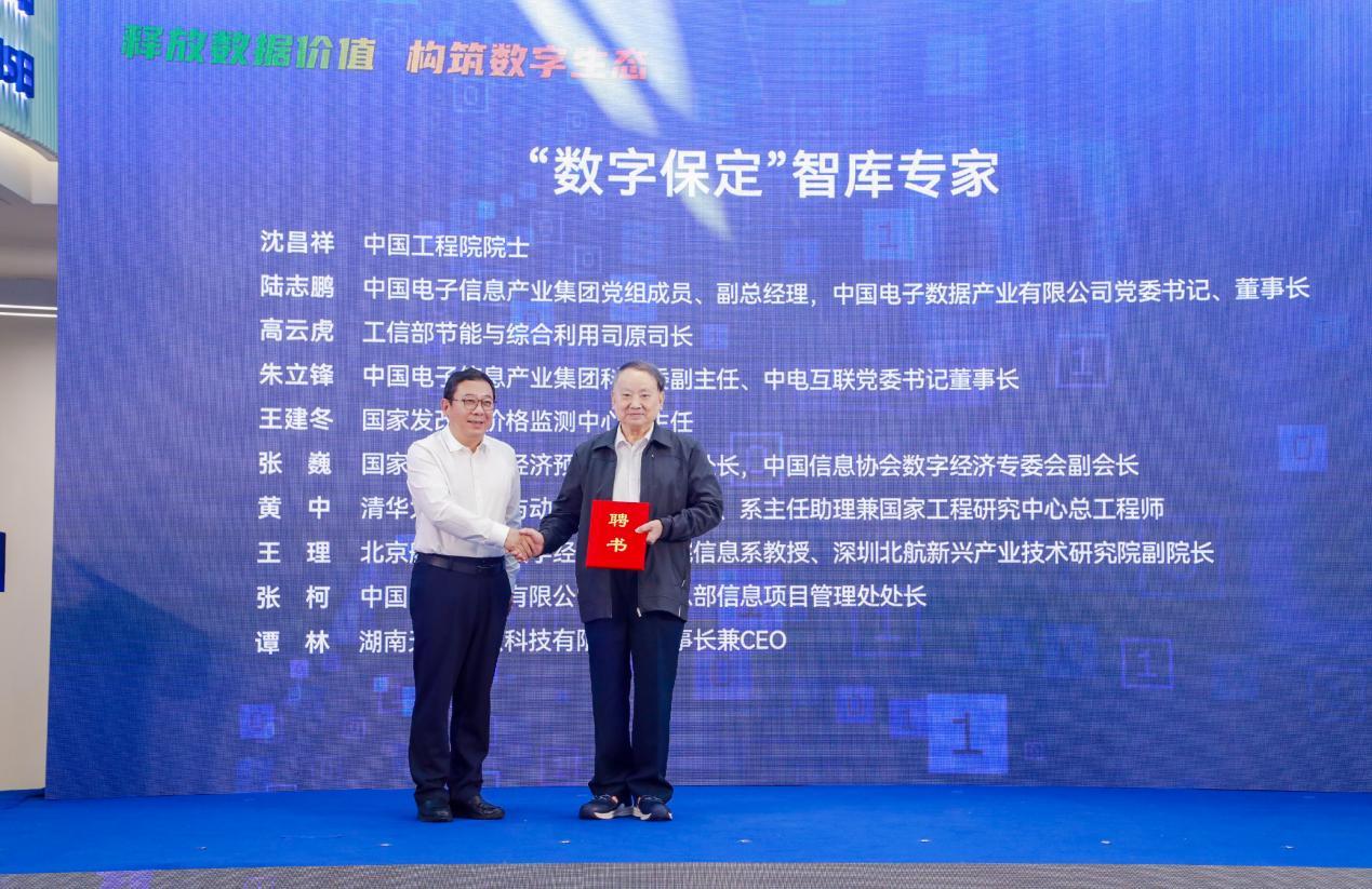为更好建设保定数据要素创新中心成为国家行业数据交易中心,保定市聘请了一批数据要素领域的专家学者,组建国家级数字经济领域顶尖智库。大会现场为中国工程院院士沈昌祥、中国电子信息产业集团党组成员、副总经理、中国电子数据产业有限公司党委书记、董事长陆志鹏、工信部节能与综合利用司原司长高云虎、中国电子信息产业集团科技委副主任、中电互联党委书记董事长朱立锋、国家发改委价格监测中心副主任王建冬、国家信息中心经济预测部综合处处长张巍、清华大学能源与动力工程系研究员、系主任助理兼国家工程研究中心总工程师黄中、北京航空航天大学经济管理学院信息系教授、深圳北航新兴产业技术研究院副院长兼大数据实验室主任王理、华电科信部项目处处长张柯、湖南天河国云科技有限公司董事长兼CEO谭林等10余位专家正式颁发聘书。