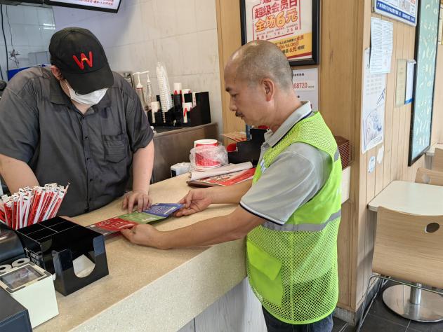 2024年5月26日,万顷沙镇督导员成员联合综合行政执法办公室到华莱士(新垦店)开展以“分类新时尚 低碳齐参与”为主题的宣传活动。活动过程中,工作人员通过发放垃圾分类宣传单的方式,向商户现场解说如何识别生活中常见的生活垃圾,如何对他们进行分类等问题,同时介绍垃圾分类的意义,鼓励商户发动身边的家人好友共同参与到垃圾分类的行动中来;并指导他们如何规范地设置垃圾分类设施和在店内可以粘贴最新的垃圾分类海报,营造门店内垃圾分类宣传氛围,让到店消费的消费者可以耳濡目染地感受到店内垃圾分类宣传氛围,从而影响更加多的人对垃圾分类有所了解和认识。