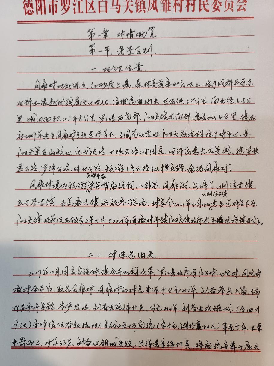 “以前我的爷爷经常给我讲村里面的趣事,尤其是三国的历史,庞统的轶事,在村里一直流传着‘庞统以身入局,帮助刘备夺取巴蜀’的故事。小的时候,每年的庙会爷爷都会带我去祭拜庞统,让我要学习庞统的为人处世之道。现在我老了,每年还是要去拜祭庞统,也经常带我的孙儿去参观庞统祠,给他讲解庞统的故事。”德阳市罗江区凤雏村75岁高龄的尹显聪说。“现在,正由我牵头,联合村里的老人,共同编制凤雏村的村志,我们想把历史文化传承下去,这样不会因为时间的推移而被遗忘,通过编制村志,我们也希望更多的人了解我们凤雏村,到我们村来旅游观光。”