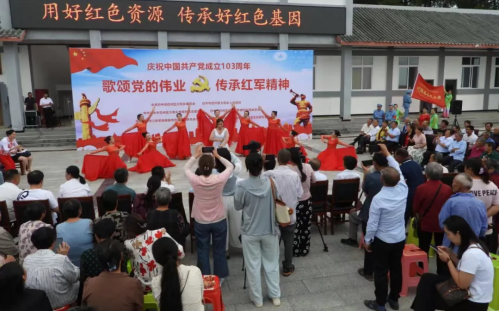 纪念活动由巴中市巴州区大和乡人大主席王海平主持。在宣布大会开始后,首先由巴中市川陕革命根据地历史文化研究会秘书长李扶摇宣读贺信,全国基层党建网主编臧学雨、中国建设传媒网总编常魁星、中红网总编江山发来贺电:“祝庆祝中国共产党成立103周年,歌颂党的伟业、传承红军精神大会暨川陕苏区文工团演出活动取得圆满成功!”四川省川陕革命根据地研究中心主任、开国将军李中权之子李洋,在贺信中说:“巴中是川陕革命根据地的首府,在第二次国内革命战争时期,在中国共产党领导下建立的工农红色政权。川陕苏区在极盛时期,拥有4.2万多平方公里的土地和500多万人口,建立有23个县(市)的苏维埃政权,组建有8万余人的正规红军,抗击了四川军阀刘湘、田颂尧先后发动的“三路围攻”“六路围攻”,向敌人发动了三次进攻战役,大小战斗数百次,重创了国民党军阀,壮大了革命力量,为中国革命燎原之势奠定了胜利的基础,被毛泽东主席誉为全国第二大苏区。川陕苏区在两年多血与火的革命斗争史可歌可泣,彪炳千秋。“智勇坚定、排难创新、团结奋斗、不胜不休”的红军精神激励后人,光耀史册!在川陕苏区这块红色的土地上,我家9人参加红军、5人牺牲在长征路上,父辈们同千千万万的红军将士为新中国的诞生与发展作出了无私的奉献。希望你们在巴中市委的坚强领导下,不忘初心、牢记使命,弘扬红军精神,为建设社会主义现代化强国、为实现中华民族的伟大复兴,为巴中高质量建设全国革命老区振兴发展示范市而拼搏奋斗、勇往前行 !”