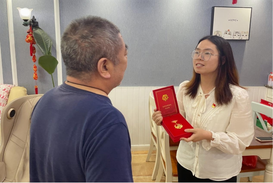 光荣在党50年,跨城发放显温情。黄桥镇滨河社区的党员李荣智因身体不便,在年初就随女儿去南京疗养。身处异乡的老人家对老家常存着一份思念,嘴里时不时念叨着想回家乡。恰逢这次“光荣在党50年”纪念章发放,滨河社区党总支副书记何觊瑜便借此“七一”,带着对老党员最崇高的敬意,跨越187公里前往南京老党员家中,送上“光荣在党50年”纪念章,并带去节日的问候和党委政府的温暖,让老人家在异地也能感受到来自家乡的关怀。 沉甸甸的纪念章,见证的是一段不平凡的岁月。为党员送章上门,不仅是对党员的肯定、致敬,更是一份荣誉,是党徽在担当奉献中闪烁的“荣光”。