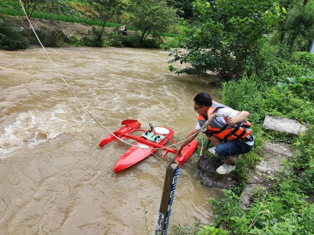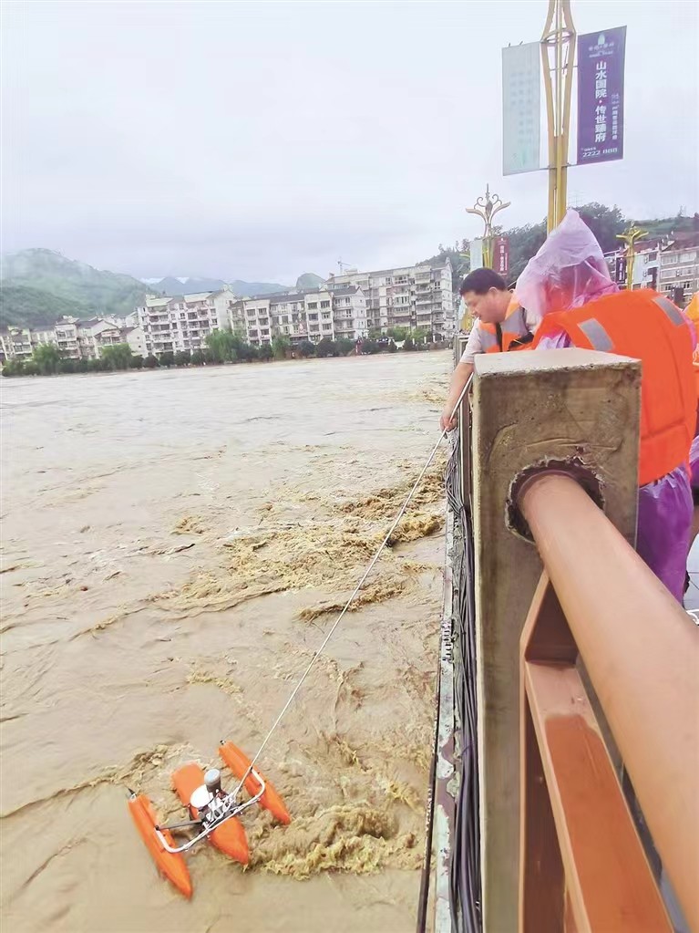 6月29日,黔东南州水文水资源局监测队员在施秉县沙坪水文站运用ADCP抢测洪峰流量。杨佐才 摄