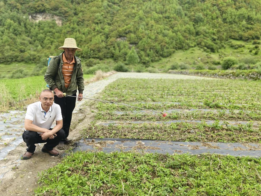 图4 范怀龚总经理查看新开宗村野生红毛五加试种驯化苗床