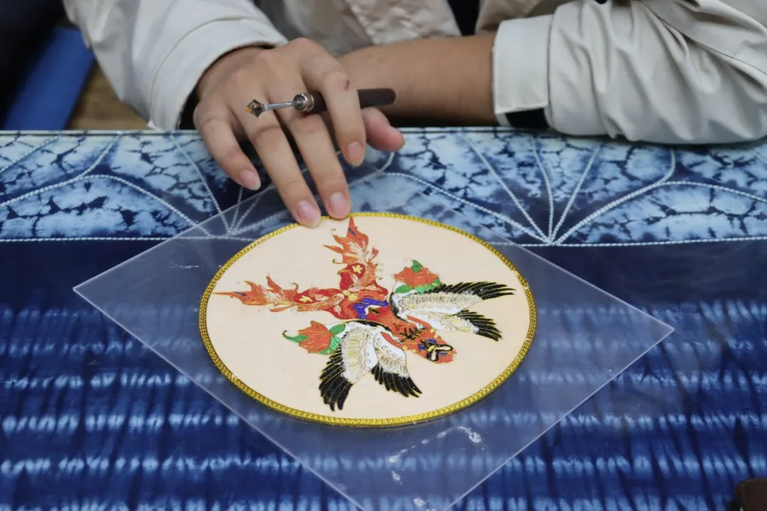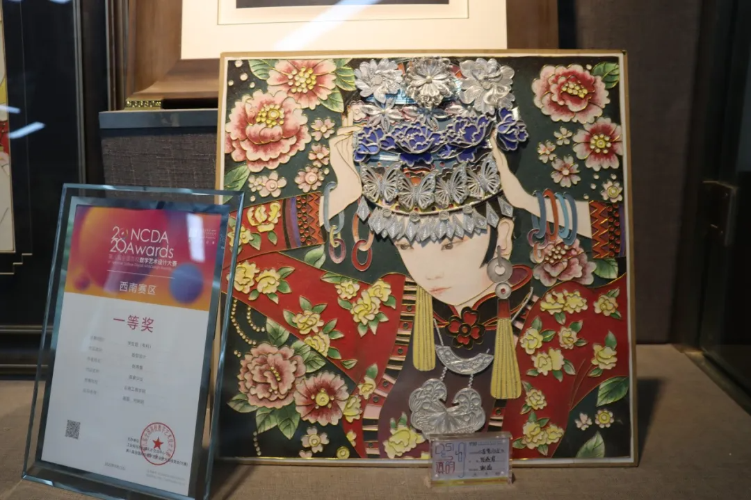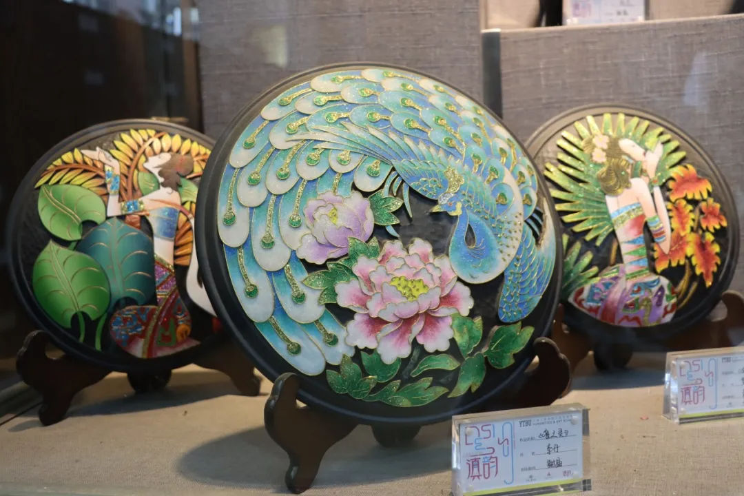 工作室内摆放着琳琅满目的“点翠”工艺作品,通过借鉴中国非物质文化遗产的点翠、花丝、景泰蓝等手工工艺,将传统工艺特色、云南地方民族特色、现代审美艺术进行融合创新,并结合社会市场需求将教学成果进行转化,研发出了一批极具地域性、民族性、创新性的纯手工工艺品。