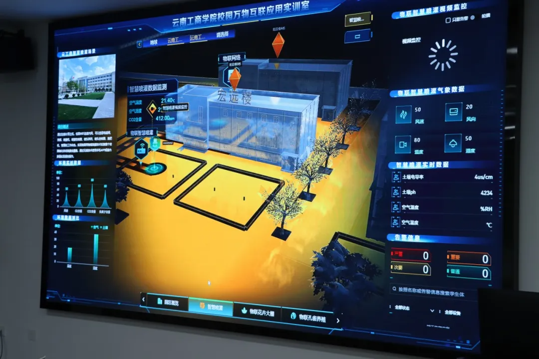 走进云南工商学院智能科学与工程学院“无线技术应用实践中心”的机房教室里,一块汇聚全校9000多个AP结点数据的电子智能大屏上,显示着校园全景地图与各类数据。学院计算机专业老师周咪在电脑上简单操作后,万物互联场景便展现眼前。