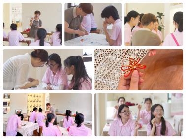实践团首先来到嘉善县大云镇非遗盘扣工作室,在非遗传承人彭利华、沈萍的带领下,参观盘扣文化展馆,深入了解盘扣制作工艺及其在嘉善县非物质文化遗产中的重要地位。团队成员有幸在彭利华老师的手把手带领下,体验非遗盘扣的魅力,在动手实践中认识到盘扣复杂的制作流程,在交流分享中明白文化传承对乡村振兴的重要性。