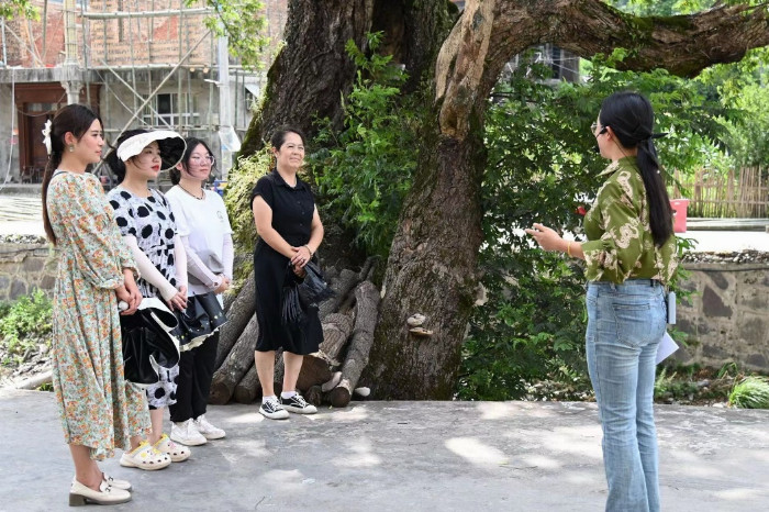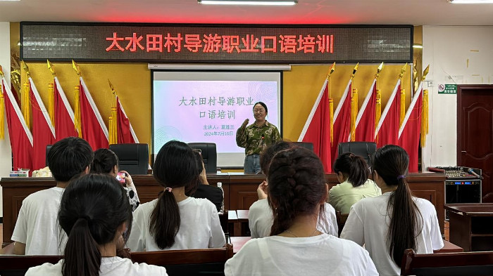 推广普通话是提升导游服务质量的关键,更是促进乡村与外界交流、推动乡村振兴的重要桥梁。随着大水田村红色旅游的蓬勃发展,培养具备良好口语表达能力的导游成为乡村振兴的迫切需求。“雅言文明”推普志愿服务队指导老师之一,湖南省省级普通话测试员夏胜兰聚焦于导游职业口语,通过生动有趣的案例、互动练习、实地示范,深入浅出地讲解了普通话的发音规范、口语表达技巧以及导游服务中的常用语,为当地有志于从事导游工作的村民们开展专项培训。通过提高村民的语言表达能力,更好地展示大水田的独特魅力,传承红色基因,吸引更多的投资者,为乡村振兴赋能。