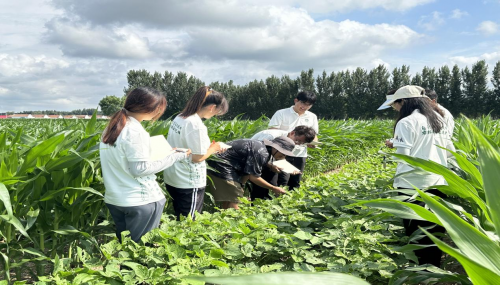 脚下粘满泥土,心中沉淀真情。在了解了齐力新农业服务有限公司的的基本情况后,团队成员对此类农业新型经营主体的建设有了更深刻的认识思考,并开展了为期三天的劳动实践。7月27日,团队成员在公司新入职研究员的带领下来到了田间,骄阳烈日不及农科学子的心中炽热,在劳动中,团队成员在24个高产攻关田间穿梭,仔细聆听研究员的讲解,亲身体验水肥一体化灌溉模式的配方施肥操作,完成40亩玉米大豆带状复合种植田的虫害调查记录,帮助完成高产攻关田的除草打药。“玉米大豆带状复合种植技术在近几年的中央一号文件中被多次提出,‘玉米不减产,多收一季豆’是真正值得推广的惠民增收好技术。”驻村大学生付鸿宇向团队介绍他的试验地块,成员们对此项丰产增效技术也有了了课本之外感悟与理解。1000余亩高产攻关示范田,搭配全要素农情监测,水肥一体化灌溉,农田智能化管理,团队成员们也在助农实践中看到了现代化农业栽培管理的齐河答卷。