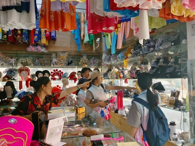 实践团还走访了拥有浙江省非遗代表性戏剧服装制作技艺的黄泽镇,与一家开了十余年的老戏具店店主进行了一次细致且全面的交谈。从交谈中团队了解到越剧戏服市场对于价格、做工等多方面的需求、“线上+线下销售”、“工厂直销”的创新营销模式,广阔的产品销售范围与多样化销售渠道。这些经验对团队成员计划在东王村引入戏服体验这一构想提供产业基础与支持。