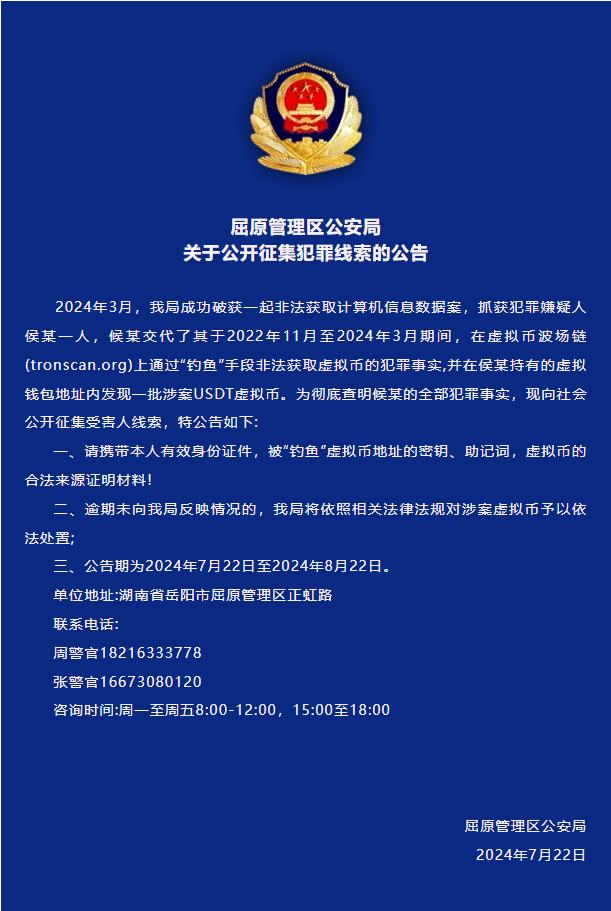 2024年3月,我局成功破获一起非法获取计算机信息数据案,抓获犯罪嫌疑人侯某一人,候某交代了其于2022年11月至2024年3月期间,在虚拟币波场链(tronscan.org)上通过“钓鱼”手段非法获取虚拟币的犯罪事实,并在侯某持有的虚拟钱包地址内发现一批涉案USDT虚拟币。为彻底查明候某的全部犯罪事实,现向社会公开征集受害人线索,特公告如下: