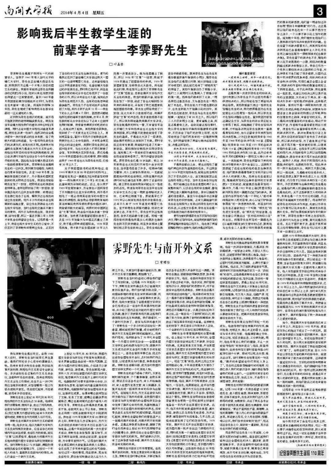 回想1979年我初抵南开大学时,李先生对我之生活起居以及课业与交通之种种垂顾和安排,不仅曾使我深怀感激,而且也感动和影响了当时南开大学负责接待我的许多位教师和工作人员。因此,当我来到南开大学以后,遂油然产生了一种极为亲切的恍如游子归家的感觉。所以就在这一年暑期,当舍侄言材报考大学时,我就建议他要以南开大学为第一志愿而考入南开大学。他入学后曾蒙受到诸位师长的亲如子侄的关怀和教诲。