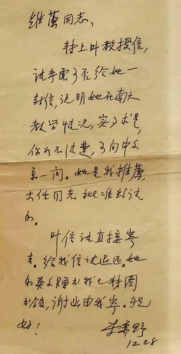 李霁野先生致南开大学滕维藻校长信函,谈及推荐叶嘉莹先生来南开任教事宜