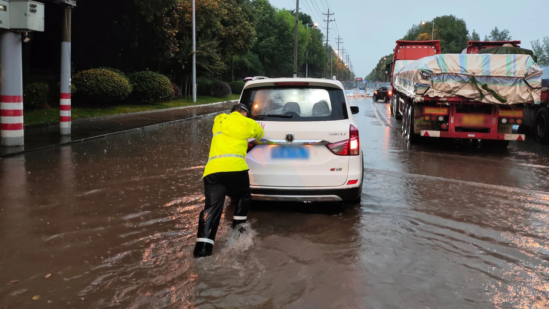 日前,铜梁迎来强降雨天气,暴雨倾盆,部分道路积水严重,车辆行驶视线受阻、速度缓慢,导致交通压力增大。铜梁区公安局交巡警支队闻汛而动,全员到岗,执勤保畅。当天19时许,骁骑队员在铜梁区红旗缸盖厂外维护交通秩序,发现一辆面包车因积水太深熄火滞留马路,立即化身“推车侠”,奋力将滞留在积水中的车辆推行至安全区域,有效保障了群众的生命财产安全。