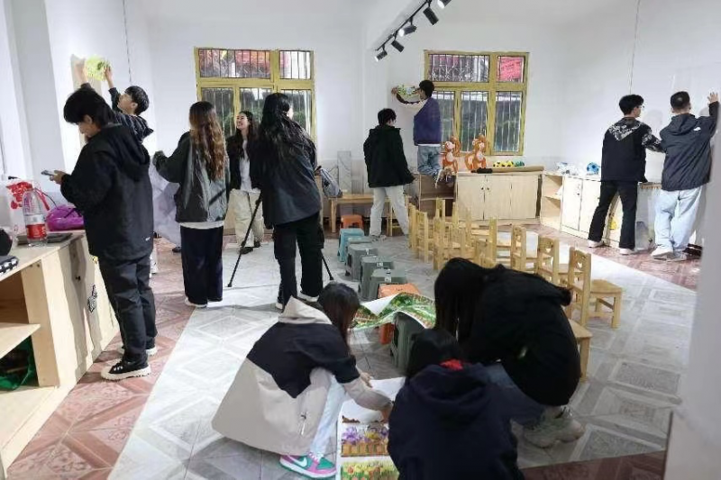 而为了营造一个既温馨又富有学习氛围的“童伴之家”,实践团成员们在抵达夏令营的第一天就开始忙碌起来。成员们利用各种装饰材料和教学道具,在房间里精心设计和布置。墙壁挂上了孩子们的作品和励志的标语,角落设立了阅读角和艺术区,一个原本空旷、毫无生气的房间转变成一个充满活力和参与感的教育空间。在这样的环境中,孩子们的好奇心被极大地激发,学习变得更加积极投入。