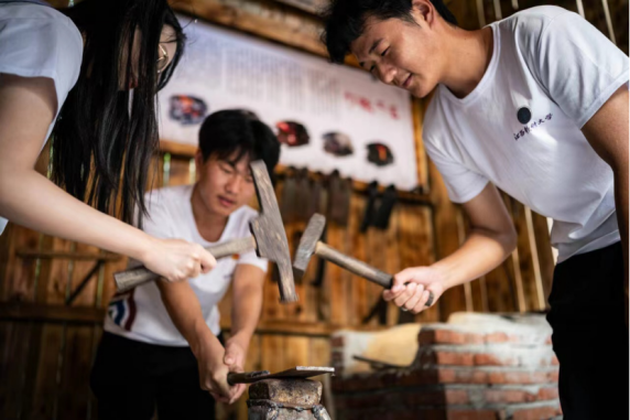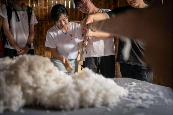 为弘扬中国传统非遗文化,实践队来到光明乡,亲身体验打铁、弹棉花、打糍粑等传统技艺,深入了解了中华民族的非物质文化遗产。这不仅是一次技艺的学习,更是一次文化的传承。非遗保护不是将其束之高阁,而是让它真正融入百姓的日常生活,成为不断融入人民智慧和时代创造力的生动实践,实践队员们沉下己心,用心感受着非遗匠心。