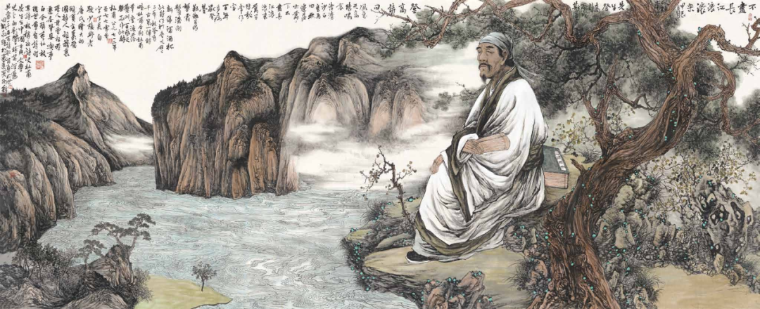 前不久,田耘给我发来一组巨幅人物画,他画的杜甫,端坐在今已消失的“夔门天险”的山崖之畔,目光深邃,悲满潭壑,悲悯地俯瞰着战乱中的山河大地;他画的孔子率众弟子迎接远方来客,孔夫子与诸门人表情真挚,气氛庄重,人物的形貌各异,展现出画家驾驭大题材大场面的深厚功力;他画的商圣范蠡,睿智中带有一丝狡黠,这是一位曾在刀尖上走过几遭的越国名臣,在功成名就之后“隐遁江湖”经商致富的传奇人物,田耘不仅画出其衣饰之奢华,陈设之高蹈,而且画出了他满脸的忧思和洞悉世情的睿智。画人难,难在传神。我以为,田耘笔下的这些古人,凝聚着他的思考,是他对其各自所在的历史方位的重新演绎,是他对其人生况味的重新咀嚼,是他与古代先贤跨越千年的真诚对视。虽然,我依然觉得他画这些大画所用的墨色还是有些过浓过重,但我也分明感受到了这些画作的分量之厚重和思绪之深邃。我为此而感到欣慰,因为这显露出当年那个年轻气盛的“茶画家”,在绘画题材和艺术审美诸方面已有了难得的蜕变和升华。