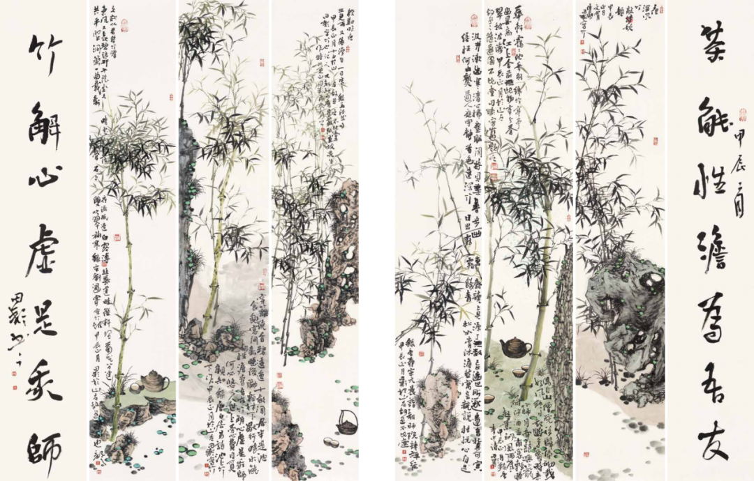 《茶能性淡为吾友 竹解心虚是我师——竹境八条屏》 纸本设色 180cm×32cm×8