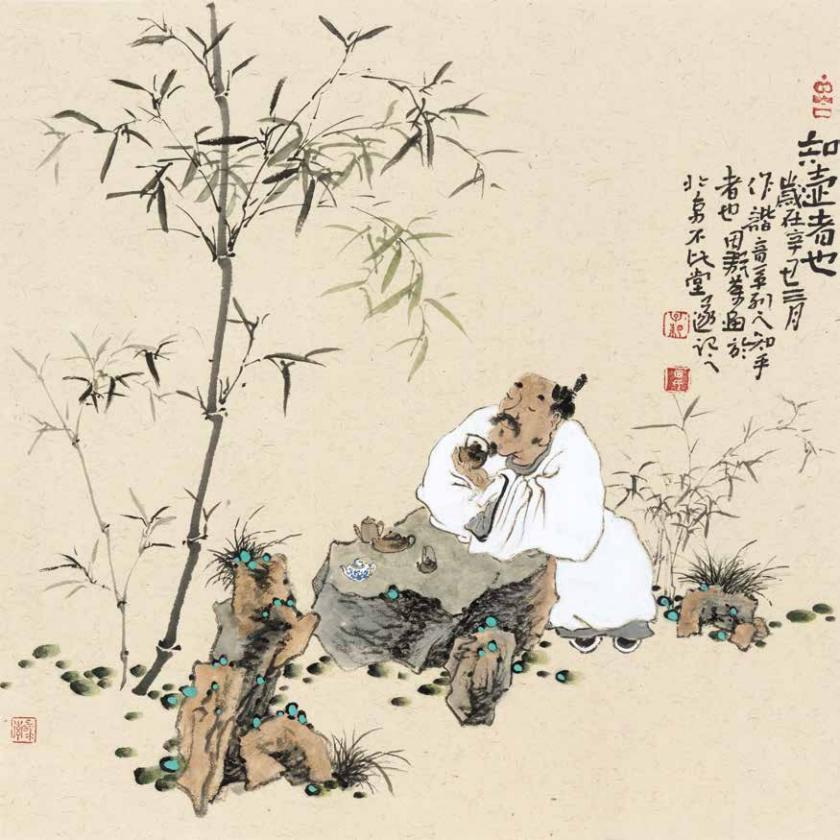 一个画家,能够营造出自己的“符号”殊为不易,而要舍弃它则更难。田耘在“茶画”的世界中沉湎日久,他是不可能完全“抛弃”的,因而我用上了“舍弃”这个概念。“舍弃”是有所保留的脱离,是打开自设的藩篱,冲到更大空间的一种选择。近年来,我一直密切关注着这位人到中年的画家,看他画山水,看他画人物,看他画“无茶”的茶画,看他画“无僧”的禅画,看他走进历史,走进人文,画诗境,画先哲,画往圣……由此,我看到了一个新的田耘,不再只是一个“茶画家”,而是一个视野开阔贯通古今的全能画家了!