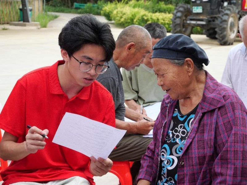 图为志愿团成员辅导村民完成知识竞赛题。淦涌 摄