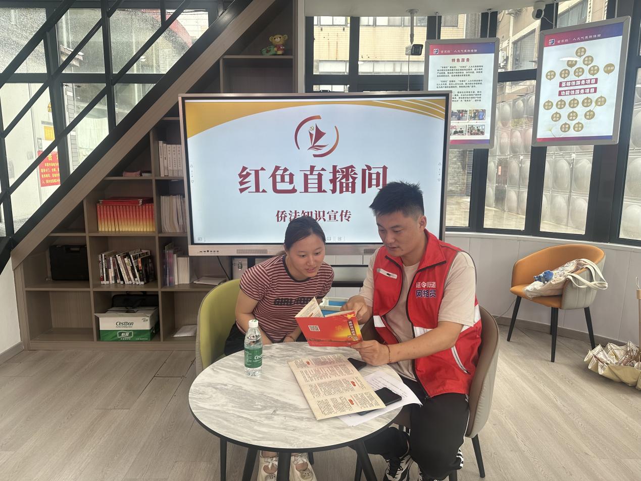 暖侨心,线上线下广宣传。线下,利用电子屏、宣传栏等广泛发布侨法侨规相关内容,向居民发放《涉侨常用政策问答》等宣传资料;线上,依托“百家红”红色直播间详细讲解侨法在实际生活中的应用、涉侨纠纷实际案例等内容,扩大普法范围,增强普法效果。