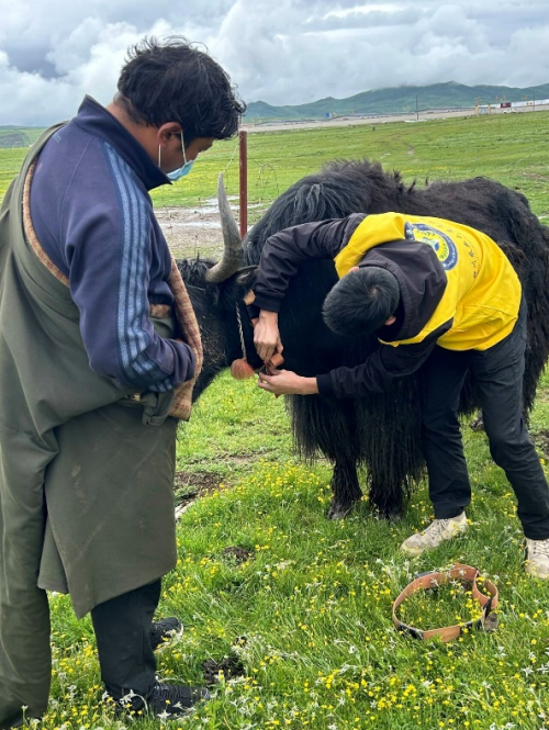 图3 团队成员为牦牛佩戴新一代自研北斗北斗放牧项圈