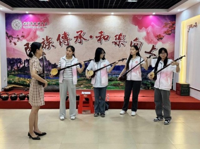 此外,学校通过主题班会、国旗下讲话等形式,常态化开展民族文化教育宣传,积极打造品牌活动。与天琴演奏家、乐器研制大师、壮族天琴艺术研究学会会长朱仲衡老师紧密合作,成功研制电音天琴,解决了表演中音量不足的问题,并开发了低音和倍低音天琴,拓宽了天琴的音域,增强了其艺术表现力。