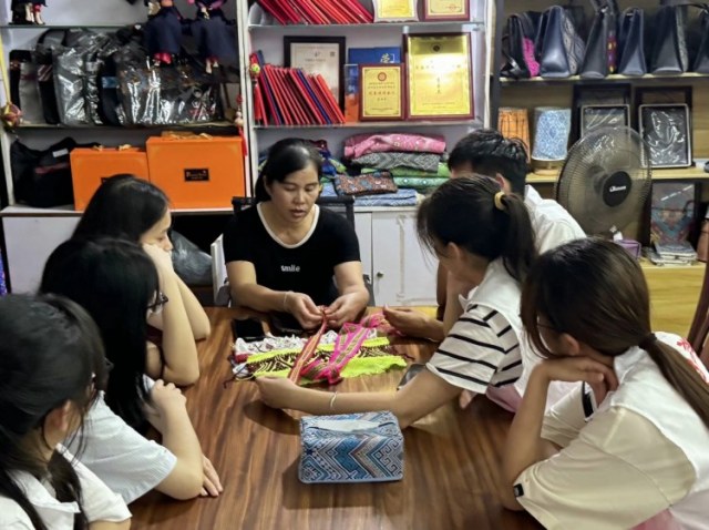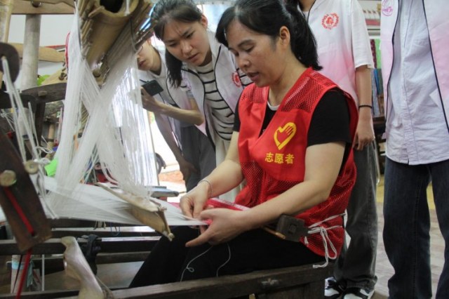 壮锦传承人李素琴老师在为实践队员讲解壮锦纹样背后的文化内涵。林玥 摄